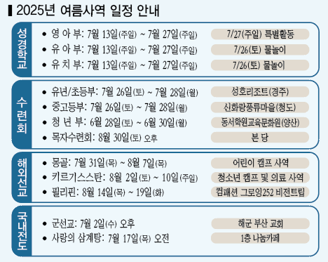 2025년 여름사역 일정 안내 페이지 정보 작성자 관리지기 작성일25-06-28 11:11 조회2,683회 댓글0건 관련링크 목록 본문 ◆ 2025년 여름사역 일정 안내 댓글목록 등록된 댓글이 없습니다. 목록