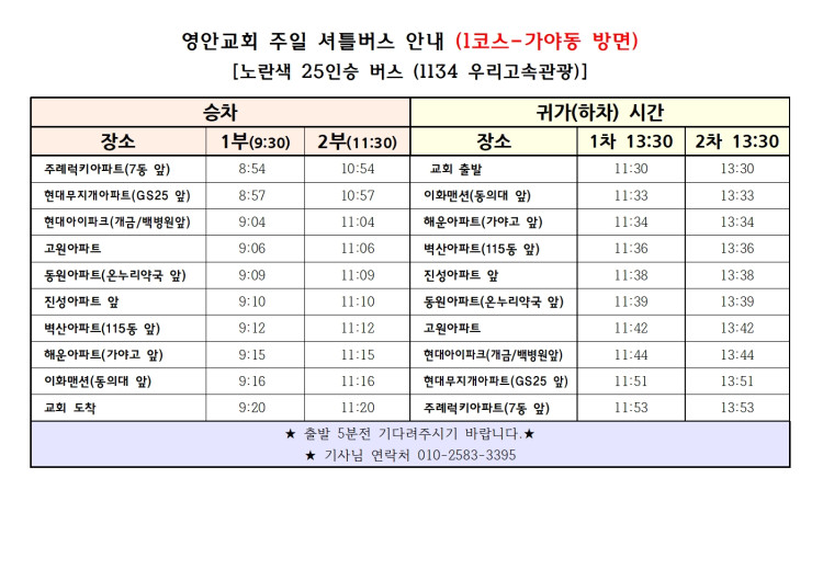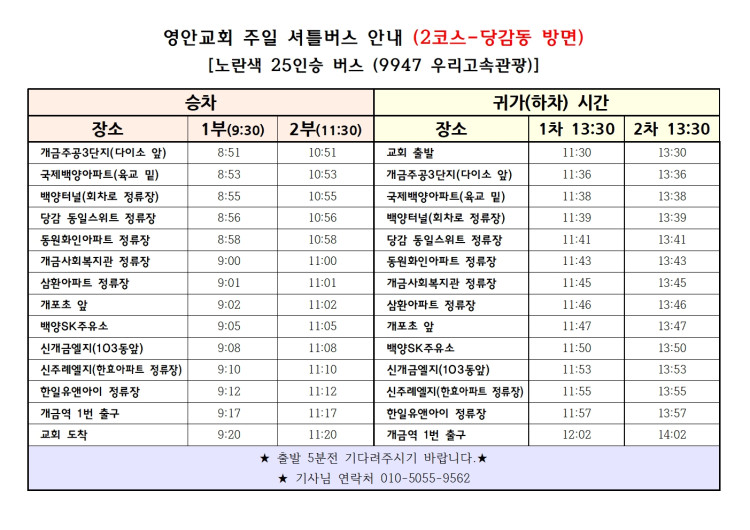 교회 셔틀 버스 운행 시간표 페이지 정보 작성자 관리지기 작성일25-02-28 17:47 조회3,752회 댓글0건 관련링크 목록 본문 * 교회 셔틀 버스 운행 시간표 댓글목록 등록된 댓글이 없습니다. 목록