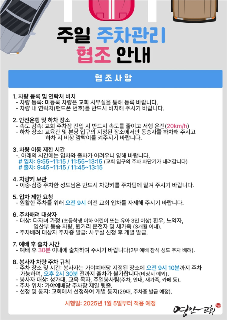 2025 주일 주차관리 협조 안내 (가야예배당) 페이지 정보 작성자 관리지기 작성일24-12-21 14:24 조회4,386회 댓글0건 관련링크 목록 본문 ◆ 2025 주일 주차관리 협조 안내 (가야예배당) 댓글목록 등록된 댓글이 없습니다. 목록