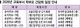 2026년 교육부서 학부모 간담회 일정 안내 페이지 정보 작성자 관리지기 작성일26-01-24 10:41 조회1,345회 댓글0건 관련링크 목록 본문 ◆ 2026년 교육부서 학부모 간담회 일정 안내 (3면 참조) 댓글목록 등록된 댓글이 없습니다. 목록