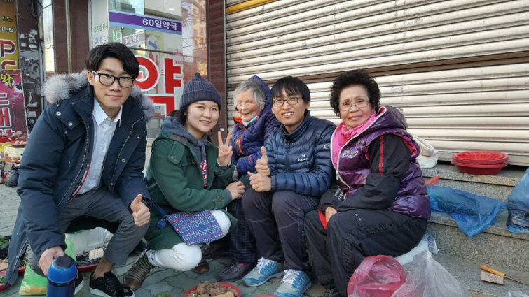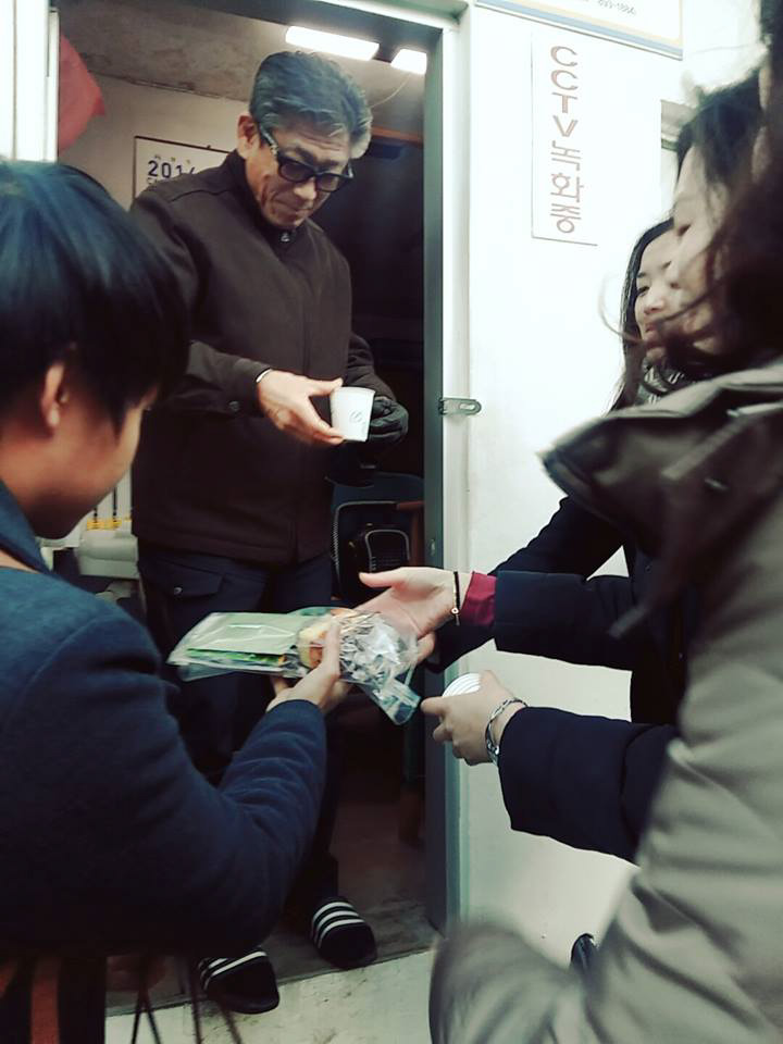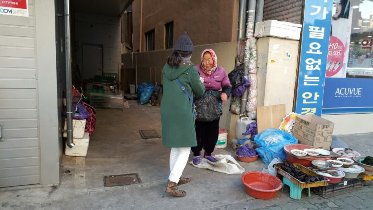 이어서 가야 예배당 일대의 시장, 아파트, 노점상, 폐휴지 줍는 분 등 휴일이고 추운 날씨임에도 삶의 터전에서 열심히 사시는 이웃들에게 조별로 다가가 이야기를 들어주고 따뜻한 차와 간식을 나눠드렸습니다.