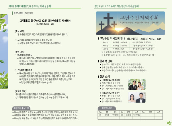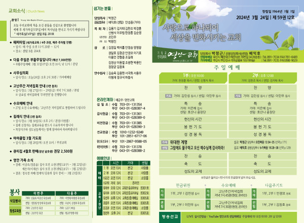 2024년 3월 24일 주보 (센텀예배당) 페이지 정보 작성자 관리지기 작성일24-03-23 10:50 조회3,177회 댓글0건 관련링크 목록 본문 2024년 3월 24일 주보 (센텀예배당) 댓글목록 등록된 댓글이 없습니다. 목록