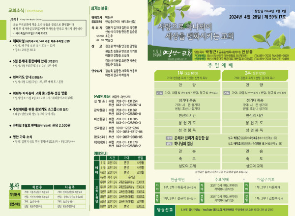 2024년 4월 28일 주보 (가야예배당) 페이지 정보 작성자 관리지기 작성일24-04-27 10:45 조회3,445회 댓글0건 관련링크 목록 본문 2024년 4월 28일 주보 (가야예배당) 댓글목록 등록된 댓글이 없습니다. 목록