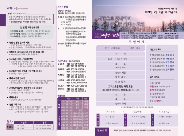 2024년 2월 11일 주보 (센텀예배당) 페이지 정보 작성자 관리지기 작성일24-02-08 13:16 조회3,367회 댓글0건 관련링크 목록 본문 2024년 2월 11일 주보 (센텀예배당) 댓글목록 등록된 댓글이 없습니다. 목록