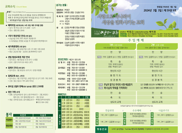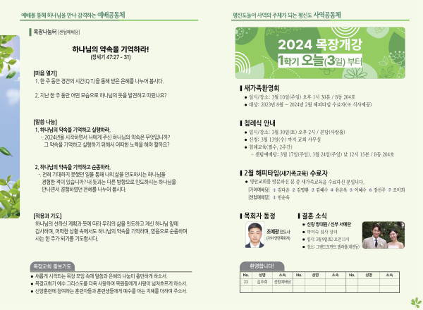2024년 3월 3일 주보 (센텀예배당) 페이지 정보 작성자 관리지기 작성일24-03-02 11:57 조회3,325회 댓글0건 관련링크 목록 본문 2024년 3월 3일 주보 (센텀예배당) 댓글목록 등록된 댓글이 없습니다. 목록