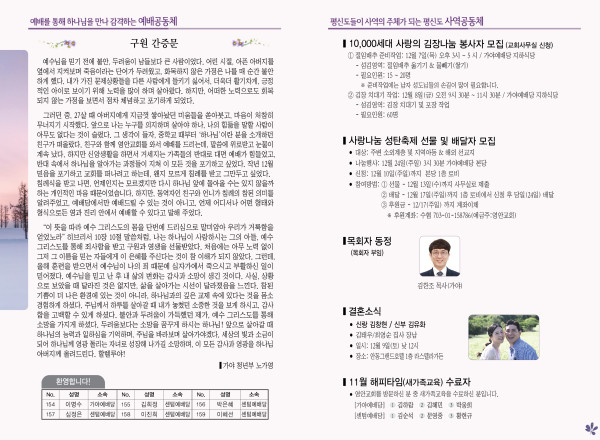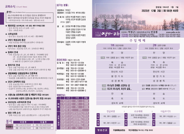 2023년 12월 3일 주보 (가야예배당) 페이지 정보 작성자 관리지기 작성일23-12-02 12:09 조회4,007회 댓글0건 관련링크 목록 본문 * 2023년 12월 3일 주보 (가야예배당) 댓글목록 등록된 댓글이 없습니다. 목록