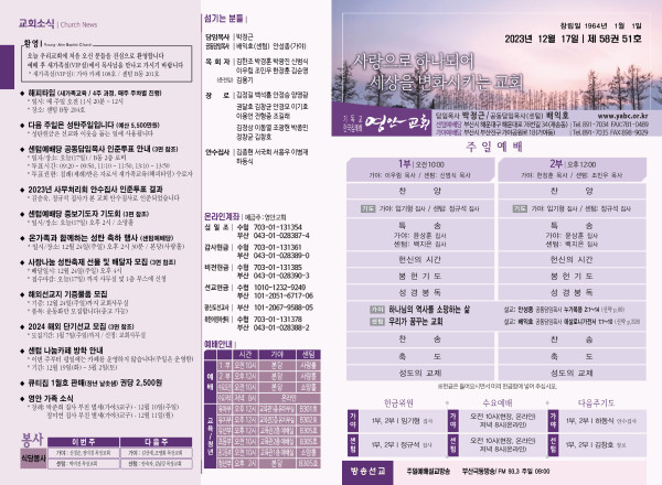 2023년 12월 17일 주보 (센텀예배당) 페이지 정보 작성자 관리지기 작성일23-12-16 11:45 조회3,577회 댓글0건 관련링크 목록 본문 2023년 12월 17일 주보 (센텀예배당) 댓글목록 등록된 댓글이 없습니다. 목록