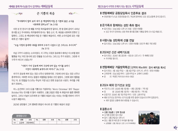 2023년 12월 24일 주보 (센텀예배당) 페이지 정보 작성자 관리지기 작성일23-12-23 11:22 조회4,010회 댓글0건 관련링크 목록 본문 2023년 12월 24일 주보 (센텀예배당) 댓글목록 등록된 댓글이 없습니다. 목록