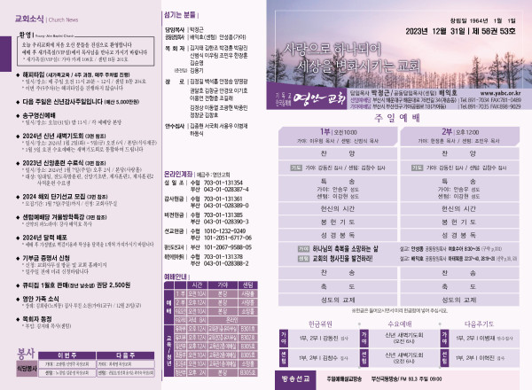 2023년 12월 31일 주보 (센텀예배당) 페이지 정보 작성자 관리지기 작성일23-12-30 11:06 조회3,530회 댓글0건 관련링크 목록 본문 2023년 12월 31일 주보 (센텀예배당) 댓글목록 등록된 댓글이 없습니다. 목록