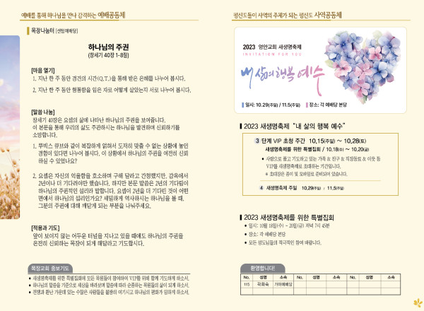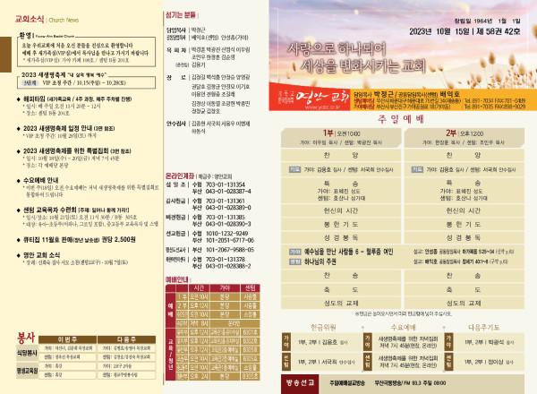 2023년 10월 15일 주보 (센텀예배당) 페이지 정보 작성자 관리지기 작성일23-10-14 11:03 조회3,756회 댓글0건 관련링크 목록 본문 2023년 10월 15일 주보 (센텀예배당) 댓글목록 등록된 댓글이 없습니다. 목록