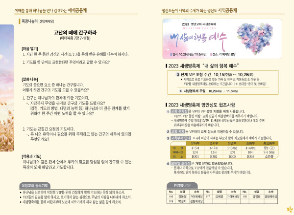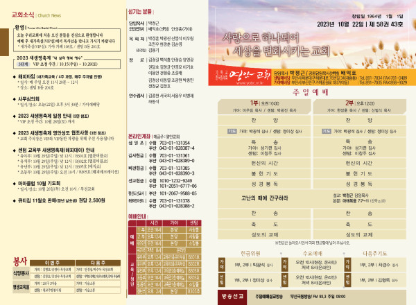 2023년 10월 22일 주보 (센텀예배당) 페이지 정보 작성자 관리지기 작성일23-10-21 09:56 조회3,555회 댓글0건 관련링크 목록 본문 2023년 10월 22일 주보 (센텀예배당) 댓글목록 등록된 댓글이 없습니다. 목록