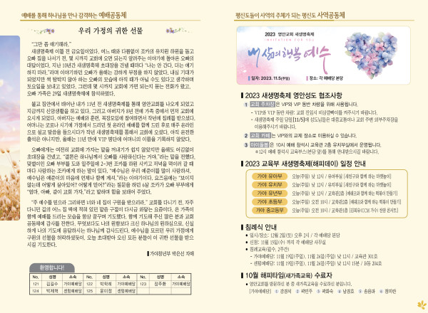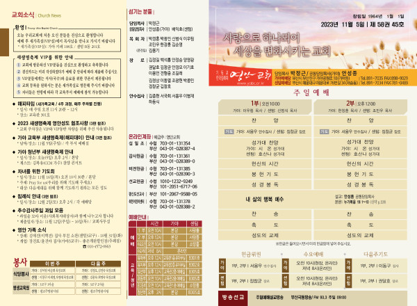 2023년 11월 5일 주보 (가야예배당) 페이지 정보 작성자 관리지기 작성일23-11-04 15:38 조회4,007회 댓글0건 관련링크 목록 본문 * 2023년 11월 5일 주보 (가야예배당) 댓글목록 등록된 댓글이 없습니다. 목록