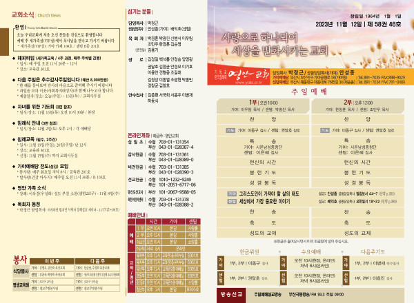 2023년 11월 12일 주보 (가야예배당) 페이지 정보 작성자 관리지기 작성일23-11-11 11:14 조회3,649회 댓글0건 관련링크 목록 본문 * 2023년 11월 12일 주보 (가야예배당) 댓글목록 등록된 댓글이 없습니다. 목록