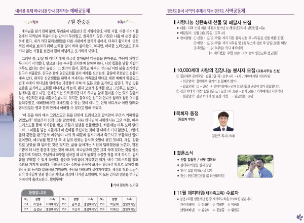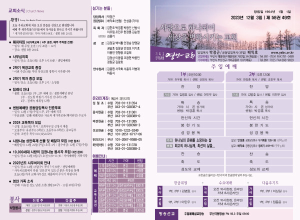 2023년 12월 3일 주보 (센텀예배당) 페이지 정보 작성자 관리지기 작성일23-12-02 11:28 조회3,763회 댓글0건 관련링크 목록 본문 2023년 12월 3일 주보 (센텀예배당) 댓글목록 등록된 댓글이 없습니다. 목록