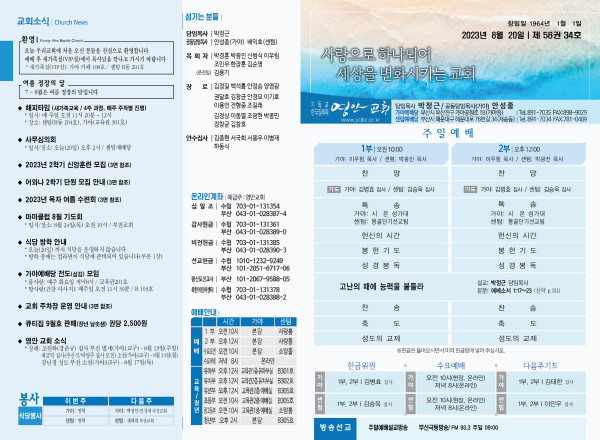 2023년 8월 20일 주보 (가야예배당) 페이지 정보 작성자 관리지기 작성일23-08-19 11:06 조회3,872회 댓글0건 관련링크 목록 본문 * 2023년 8월 20일 주보 (가야예배당) 댓글목록 등록된 댓글이 없습니다. 목록