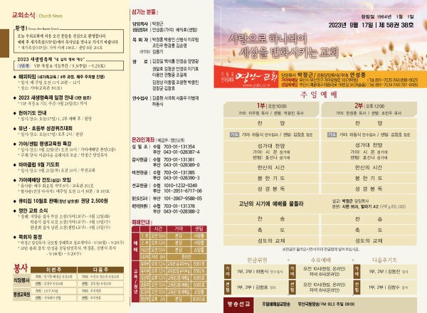 2023년 9월 17일 주보 (가야예배당) 페이지 정보 작성자 관리지기 작성일23-09-16 11:26 조회4,064회 댓글0건 관련링크 목록 본문 * 2023년 9월 17일 주보 (가야예배당) 댓글목록 등록된 댓글이 없습니다. 목록