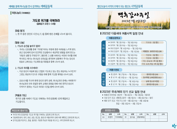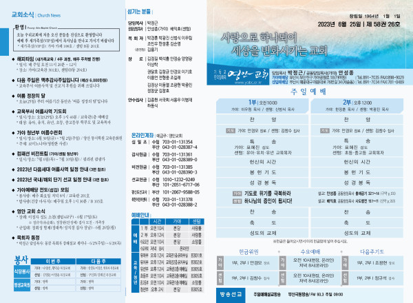 2023년 6월 25일 주보 (가야예배당) 페이지 정보 작성자 관리지기 작성일23-06-24 11:02 조회3,967회 댓글0건 관련링크 목록 본문 * 2023년 6월 25일 주보 (가야예배당) 댓글목록 등록된 댓글이 없습니다. 목록