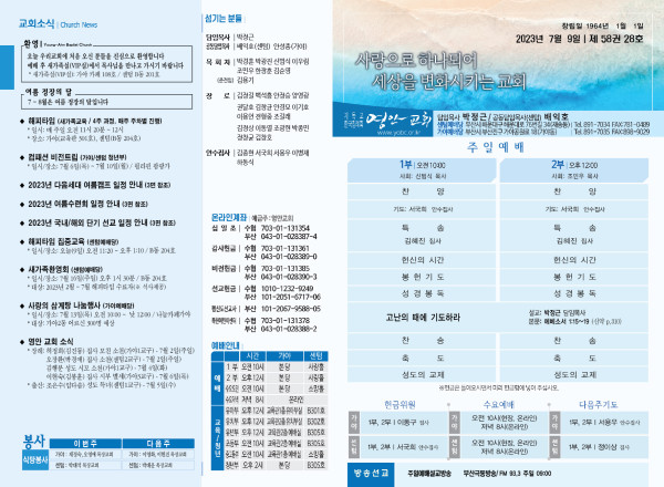 2023년 7월 9일 주보 (센텀예배당) 페이지 정보 작성자 관리지기 작성일23-07-08 10:49 조회3,910회 댓글0건 관련링크 목록 본문 2023년 7월 9일 주보 (센텀예배당) 댓글목록 등록된 댓글이 없습니다. 목록