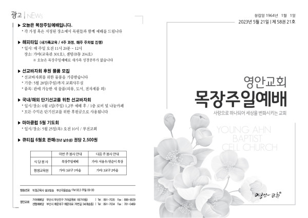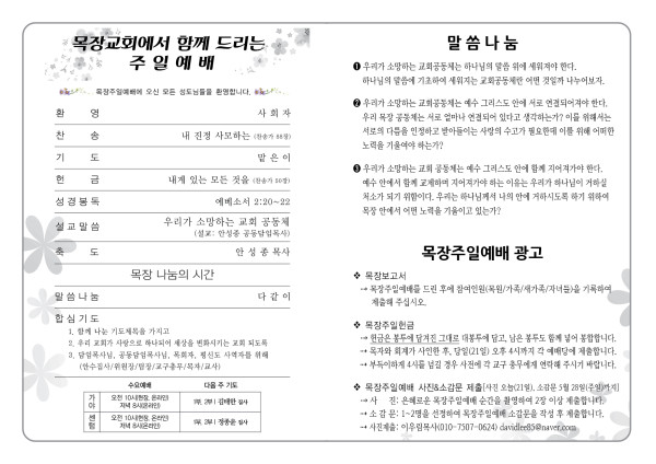 2023년 5월 21일 주보 (가야예배당)_목장주일예배 페이지 정보 작성자 관리지기 작성일23-05-20 15:20 조회4,114회 댓글0건 관련링크 목록 본문 * 2023년 5월 21일 주보 (가야예배당)_목장주일예배 댓글목록 등록된 댓글이 없습니다. 목록