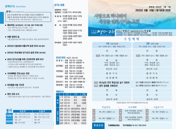 2023년 6월 18일 주보 (가야예배당) 페이지 정보 작성자 관리지기 작성일23-06-17 11:52 조회4,028회 댓글0건 관련링크 목록 본문 * 2023년 6월 18일 주보 (가야예배당) 댓글목록 등록된 댓글이 없습니다. 목록