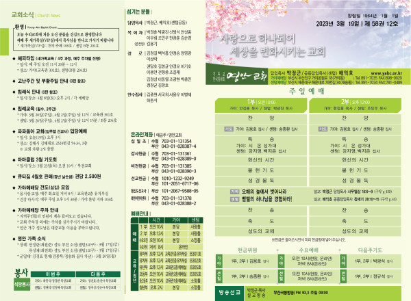 2023년 3월 19일 주보 (가야예배당) 페이지 정보 작성자 관리지기 작성일23-03-18 11:27 조회4,328회 댓글0건 관련링크 목록 본문 *2023년 3월 19일 주보 (가야예배당) 댓글목록 등록된 댓글이 없습니다. 목록