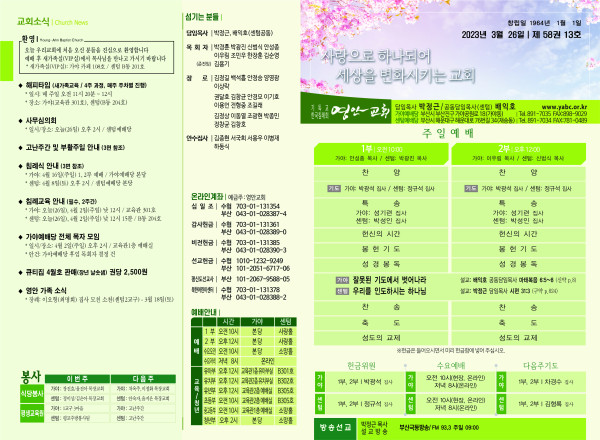 2023년 3월 26일 주보 (센텀예배당) 페이지 정보 작성자 관리지기 작성일23-03-25 11:09 조회4,104회 댓글0건 관련링크 목록 본문 2023년 3월 26일 주보 (센텀예배당) 댓글목록 등록된 댓글이 없습니다. 목록
