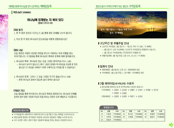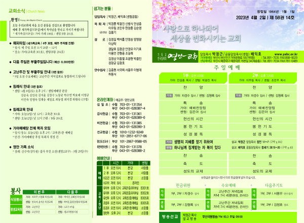 2023년 4월 2일 주보 (센텀예배당) 페이지 정보 작성자 관리지기 작성일23-04-01 11:09 조회4,138회 댓글0건 관련링크 목록 본문 2023년 4월 2일 주보 (센텀예배당) 댓글목록 등록된 댓글이 없습니다. 목록