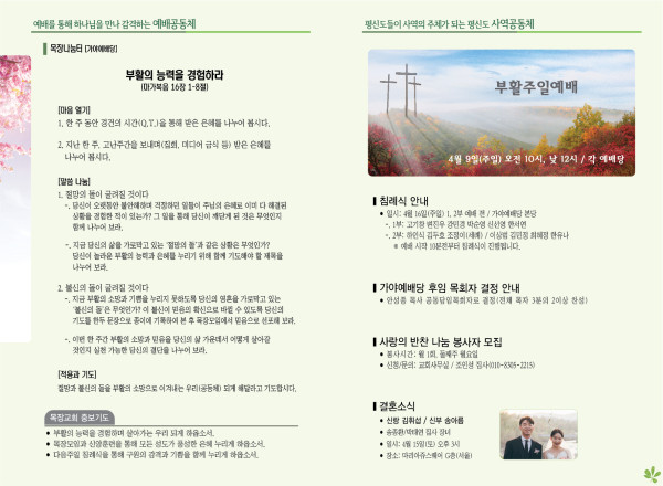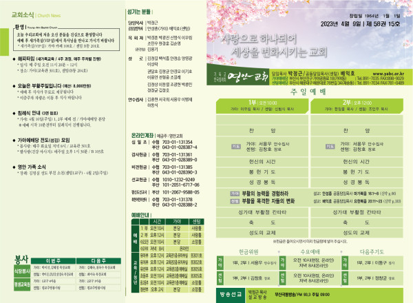 2023년 4월 9일 주보 (가야예배당) 페이지 정보 작성자 관리지기 작성일23-04-08 13:28 조회4,319회 댓글0건 관련링크 목록 본문 * 2023년 4월 9일 주보 (가야예배당) 댓글목록 등록된 댓글이 없습니다. 목록
