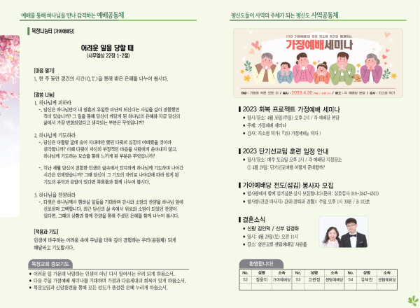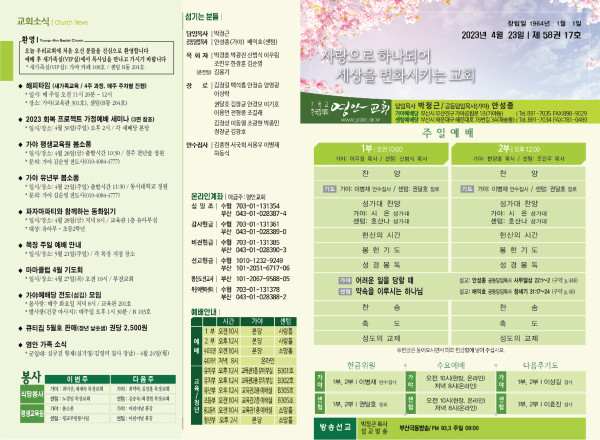 2023년 4월 23일 주보 (가야예배당) 페이지 정보 작성자 관리지기 작성일23-04-22 11:17 조회4,172회 댓글0건 관련링크 목록 본문 * 2023년 4월 23일 주보 (가야예배당) 댓글목록 등록된 댓글이 없습니다. 목록
