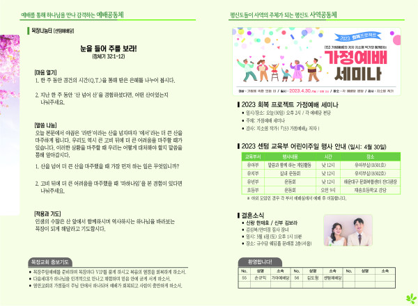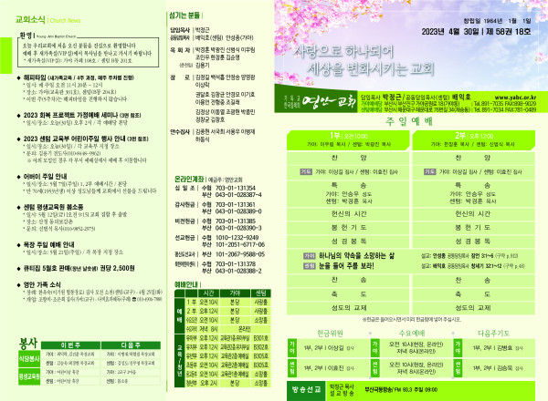 2023년 4월 30일 주보 (센텀예배당) 페이지 정보 작성자 관리지기 작성일23-04-29 11:15 조회4,185회 댓글0건 관련링크 목록 본문 * 2023년 4월 30일 주보 (센텀예배당) 댓글목록 등록된 댓글이 없습니다. 목록