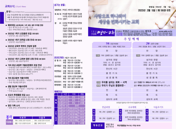 2023년 2월 5일 주보 페이지 정보 작성자 관리지기 작성일23-02-04 11:27 조회4,525회 댓글0건 관련링크 목록 본문 * 2023년 2월 5일 주보 댓글목록 등록된 댓글이 없습니다. 목록