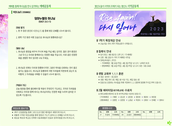 2023년 3월 5일 주보 (센텀예배당) 페이지 정보 작성자 관리지기 작성일23-03-04 11:28 조회4,325회 댓글0건 관련링크 목록 본문 2023년 3월 5일 주보 (센텀예배당) 댓글목록 등록된 댓글이 없습니다. 목록