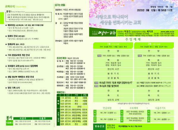 2023년 3월 12일 주보 (센텀예배당) 페이지 정보 작성자 관리지기 작성일23-03-11 11:04 조회4,337회 댓글0건 관련링크 목록 본문 2023년 3월 12일 주보 (센텀예배당) 댓글목록 등록된 댓글이 없습니다. 목록