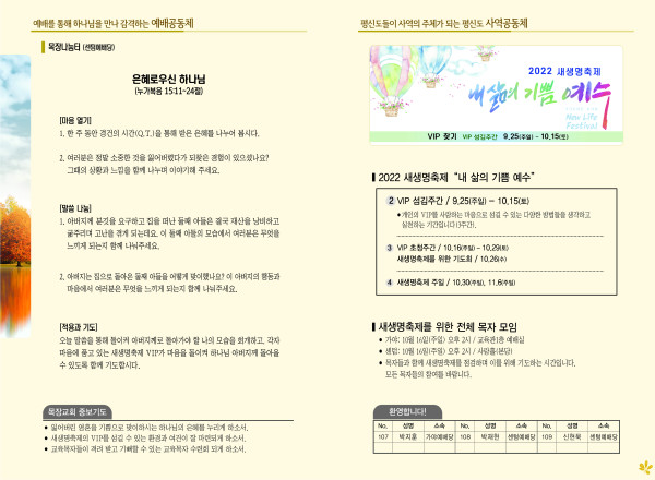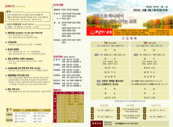 2022년 10월 9일 주보 (센텀예배당) 페이지 정보 작성자 관리지기 작성일22-10-08 11:46 조회4,560회 댓글0건 관련링크 목록 본문 2022년 10월 9일 주보 (센텀예배당) 댓글목록 등록된 댓글이 없습니다. 목록
