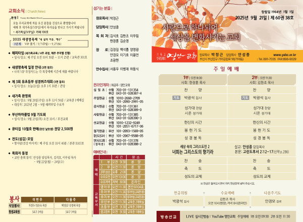 2025년 9월 21일 주보 페이지 정보 작성자 관리지기 작성일25-09-20 10:36 조회1,554회 댓글0건 관련링크 목록 본문 2025년 9월 21일 주보 댓글목록 등록된 댓글이 없습니다. 목록