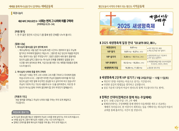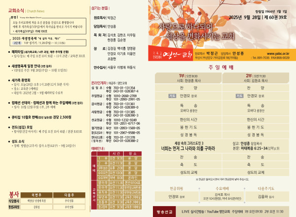 2025년 9월 28일 주보 페이지 정보 작성자 관리지기 작성일25-09-27 10:23 조회1,543회 댓글0건 관련링크 목록 본문 2025년 9월 28일 주보 댓글목록 등록된 댓글이 없습니다. 목록