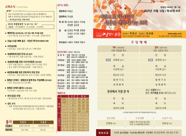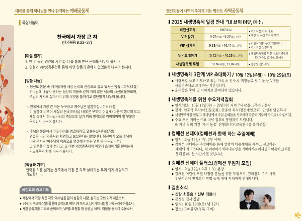 2025년 10월 12일 주보 페이지 정보 작성자 관리지기 작성일25-10-11 10:27 조회1,538회 댓글0건 관련링크 목록 본문 2025년 10월 12일 주보 댓글목록 등록된 댓글이 없습니다. 목록