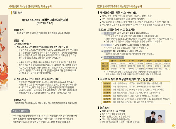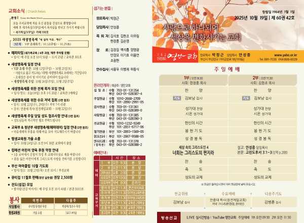 2025년 10월 19일 주보 페이지 정보 작성자 관리지기 작성일25-10-18 10:40 조회1,539회 댓글0건 관련링크 목록 본문 2025년 10월 19일 주보 댓글목록 등록된 댓글이 없습니다. 목록