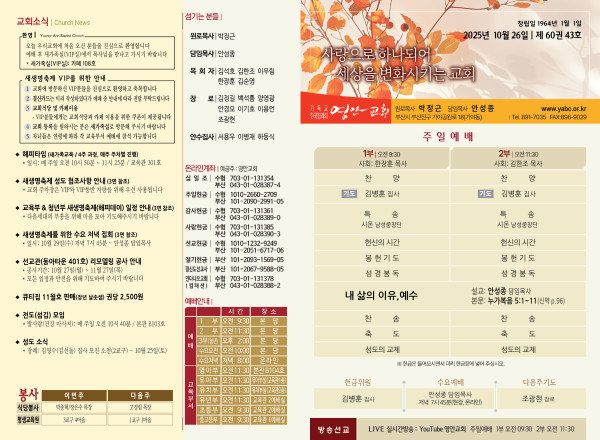 2025년 10월 26일 주보 페이지 정보 작성자 관리지기 작성일25-10-25 10:43 조회1,544회 댓글0건 관련링크 목록 본문 2025년 10월 26일 주보 댓글목록 등록된 댓글이 없습니다. 목록
