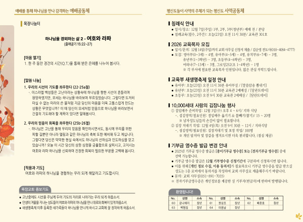 2025년 11월 23일 주보 페이지 정보 작성자 관리지기 작성일25-11-22 10:45 조회1,367회 댓글0건 관련링크 목록 본문 2025년 11월 23일 주보 댓글목록 등록된 댓글이 없습니다. 목록