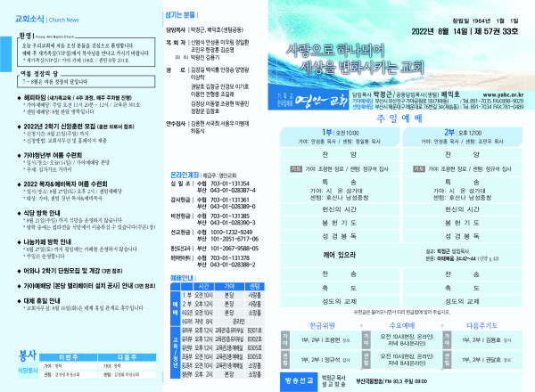 2022년 8월 14일 주보 페이지 정보 작성자 관리지기 작성일22-08-13 12:58 조회4,814회 댓글0건 관련링크 목록 본문 *2022년 8월 14일 주보 댓글목록 등록된 댓글이 없습니다. 목록