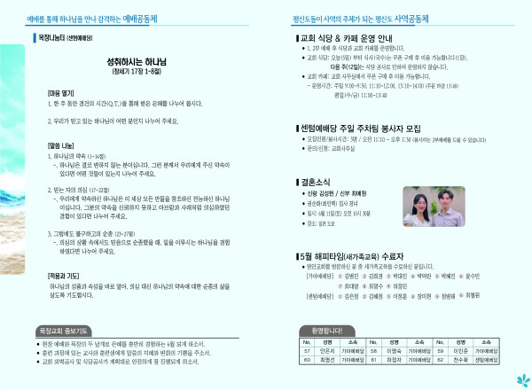 2022년 6월 5일 주보 (센텀예배당) 페이지 정보 작성자 관리지기 작성일22-06-04 11:35 조회4,944회 댓글0건 관련링크 목록 본문 2022년 6월 5일 주보 (센텀예배당) 댓글목록 등록된 댓글이 없습니다. 목록