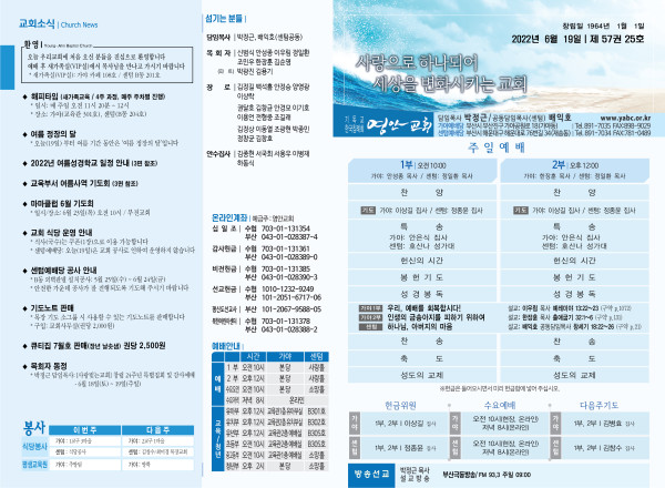 2022년 6월 19일 주보 (가야예배당) 페이지 정보 작성자 관리지기 작성일22-06-18 12:53 조회5,190회 댓글0건 관련링크 목록 본문 * 2022년 6월 19일 주보 (가야예배당) 댓글목록 등록된 댓글이 없습니다. 목록