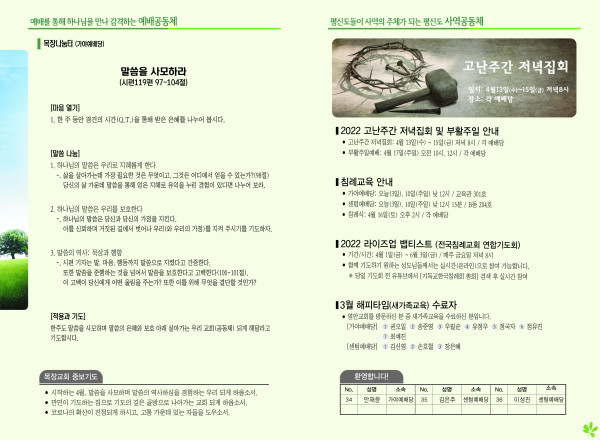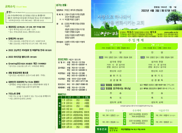 2022년 4월 3일 주보 (가야예배당) 페이지 정보 작성자 관리지기 작성일22-04-02 12:08 조회5,400회 댓글0건 관련링크 목록 본문 2022년 4월 3일 주보 (가야예배당) 댓글목록 등록된 댓글이 없습니다. 목록