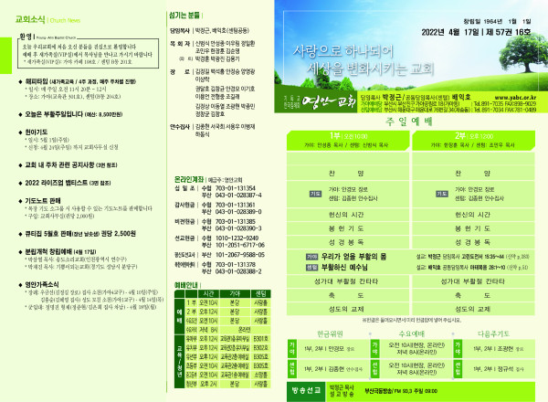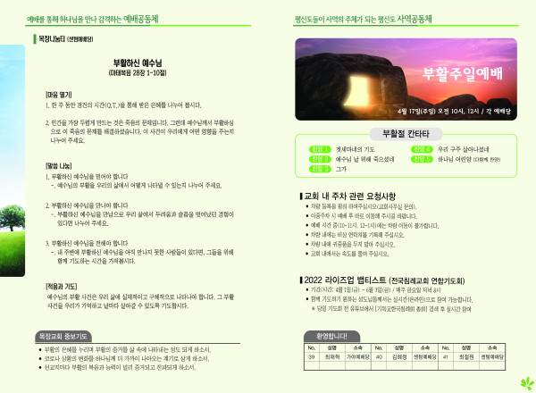 2022년 4월 17일 주보 (센텀예배당) 페이지 정보 작성자 관리지기 작성일22-04-16 11:42 조회5,379회 댓글0건 관련링크 목록 본문 2022년 4월 17일 주보 (센텀예배당) 댓글목록 등록된 댓글이 없습니다. 목록