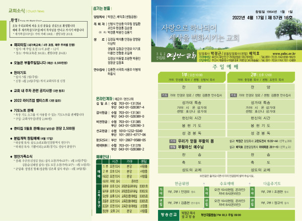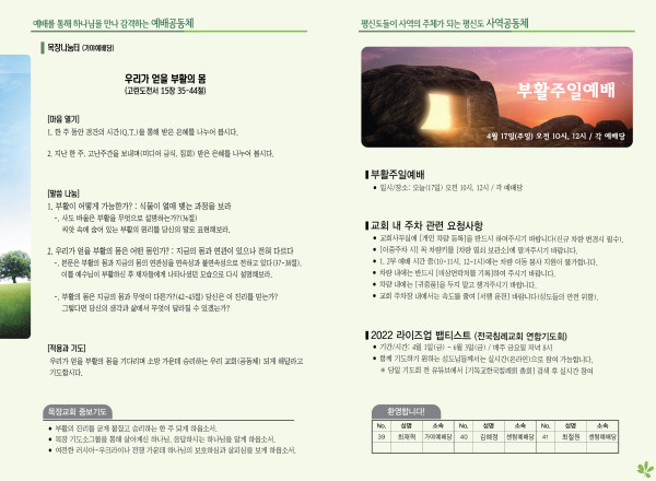 2022년 4월 17일 주보 (가야예배당) 페이지 정보 작성자 관리지기 작성일22-04-16 11:52 조회5,419회 댓글0건 관련링크 목록 본문 *2022년 4월 17일 주보 (가야예배당) 댓글목록 등록된 댓글이 없습니다. 목록