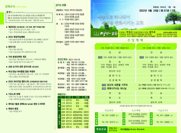2022년 4월 24일 주보 (센텀예배당) 페이지 정보 작성자 관리지기 작성일22-04-23 11:44 조회5,124회 댓글0건 관련링크 목록 본문 2022년 4월 24일 주보 (센텀예배당) 댓글목록 등록된 댓글이 없습니다. 목록