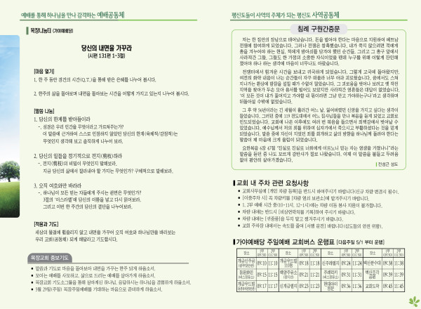 2022년 4월 24일 주보 (가야예배당) 페이지 정보 작성자 관리지기 작성일22-04-23 11:45 조회5,458회 댓글0건 관련링크 목록 본문 2022년 4월 24일 주보 (가야예배당) 댓글목록 등록된 댓글이 없습니다. 목록