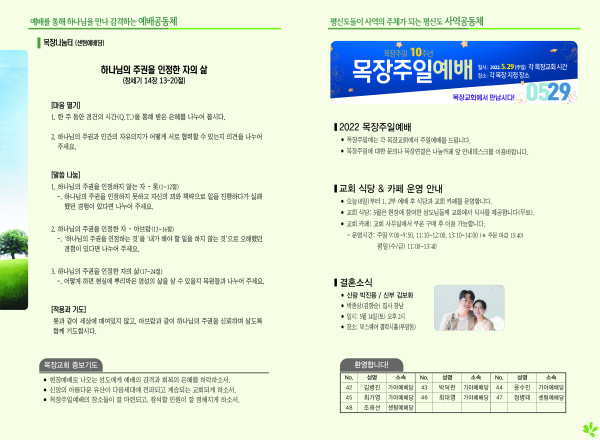 2022년 5월 8일 주보 (센텀예배당) 페이지 정보 작성자 관리지기 작성일22-05-07 11:50 조회5,536회 댓글0건 관련링크 목록 본문 2022년 5월 8일 주보 (센텀예배당) 댓글목록 등록된 댓글이 없습니다. 목록