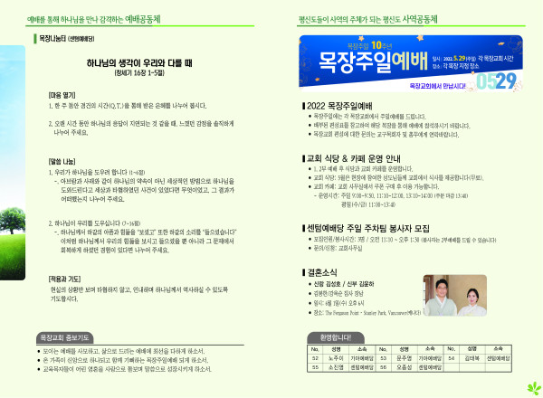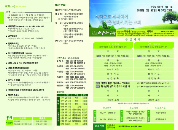 2022년 5월 22일 주보 (센텀예배당) 페이지 정보 작성자 관리지기 작성일22-05-21 11:42 조회5,206회 댓글0건 관련링크 목록 본문 2022년 5월 22일 주보 (센텀예배당) 댓글목록 등록된 댓글이 없습니다. 목록